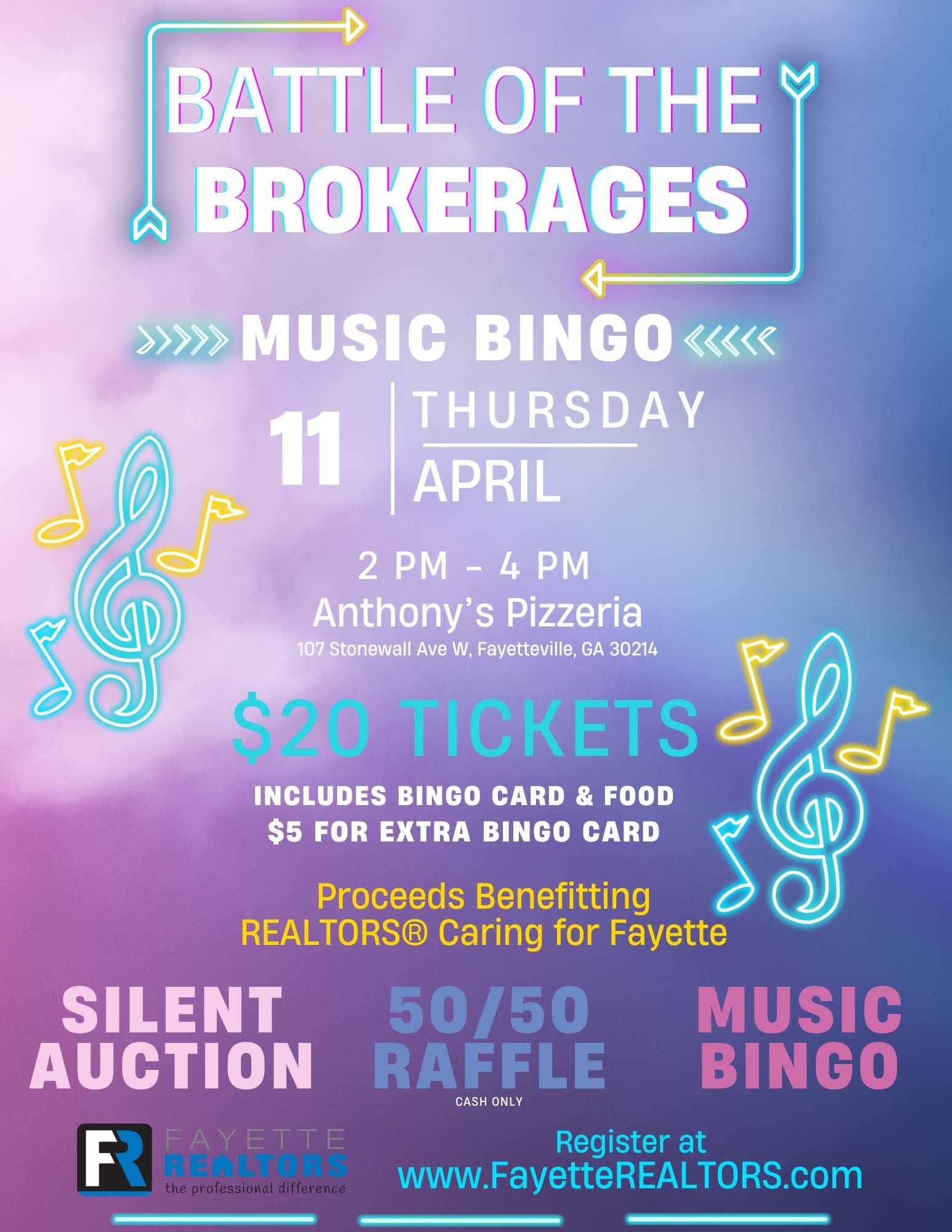 Join Fayette REALTORS® for the Battle of the Brokerages Music Bingo on April 11th from 2:00 PM to 4:00 PM at Anthony's Pizzeria. Battle of the Brokerages will also include a Silent Auction and cash only 50/50 Raffle. All proceeds will go to REALTORS® Caring for Fayette.