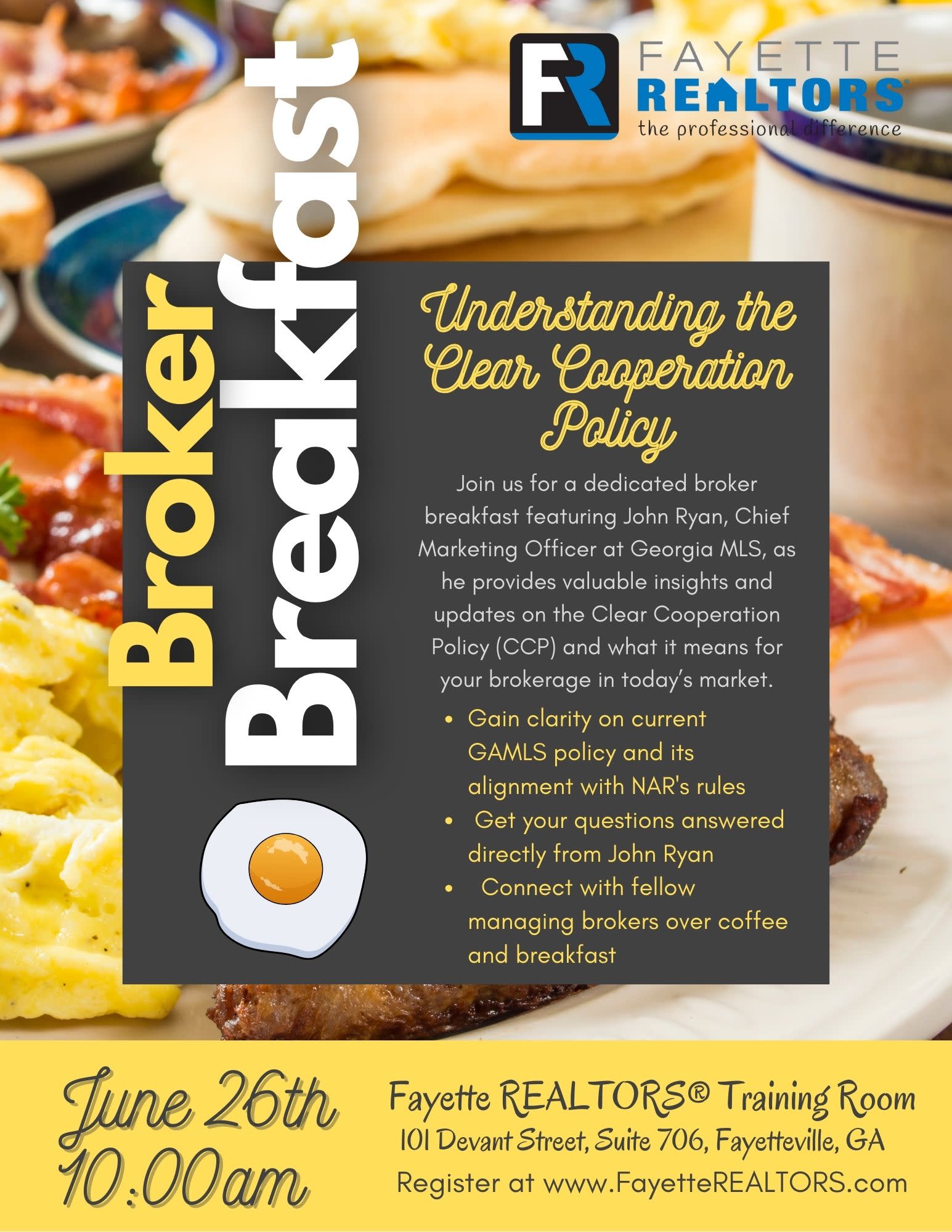 Join FCBR for a dedicated broker breakfast featuring John Ryan, Chief Marketing Officer at Georgia MLS, as he provides valuable insights and updated on the Clear Cooperation Policy (CCP) and what it means for your brokerage in today's market.