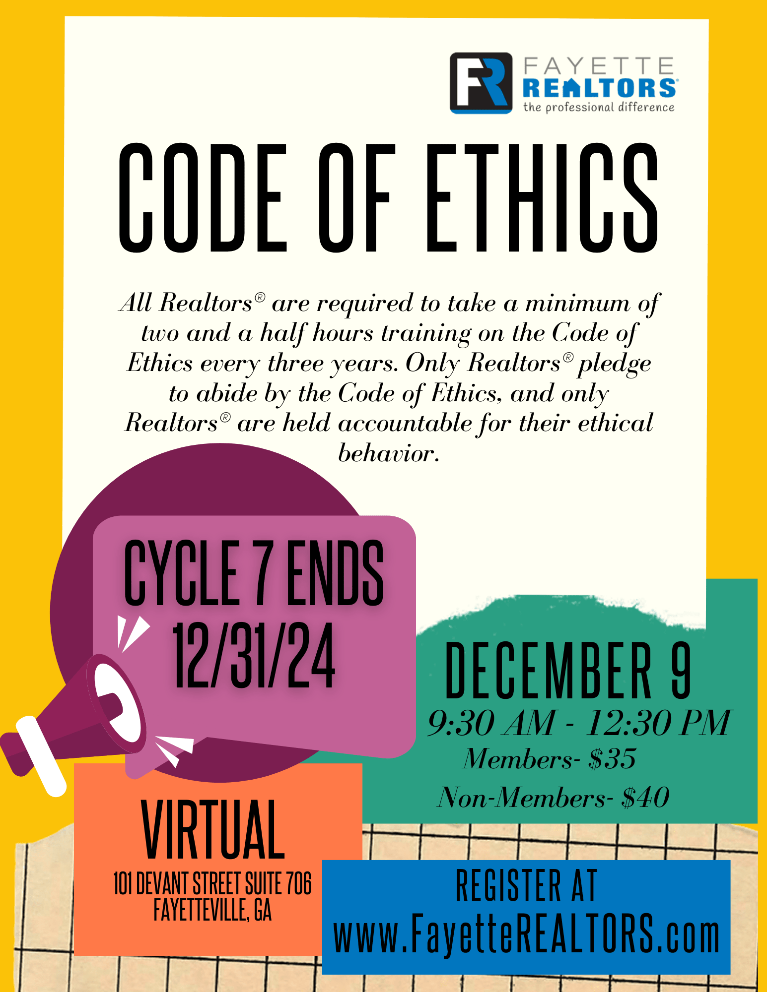 **VIRTUAL ONLY** This course meets the NAR code of ethics renewal requirement. NAR’s Code of Ethics is required every three years, but it doesn’t need to be boring! This interactive class looks at real scenarios to help you understand how the Golden Rule keeps you in compliance.