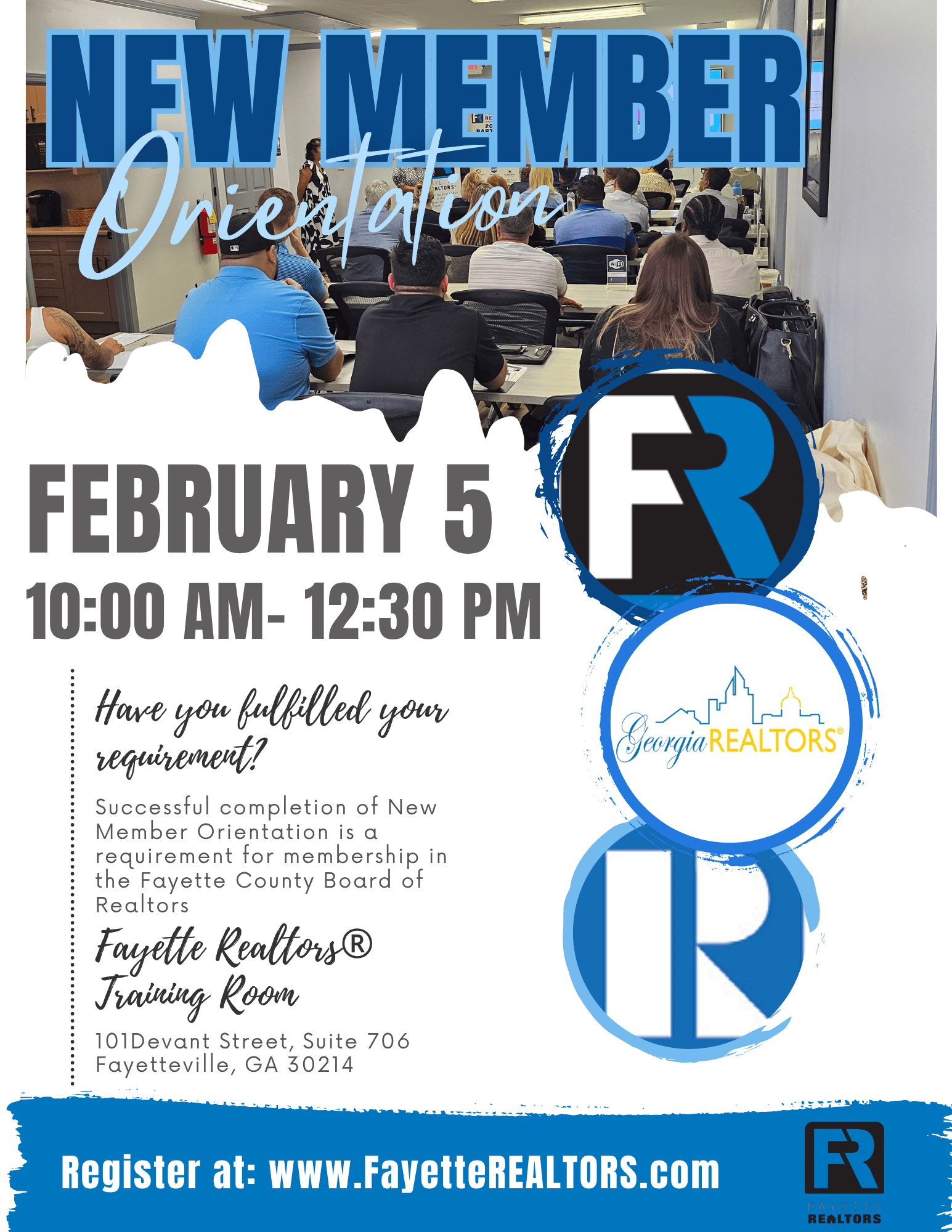 Welcome to the Fayette County Board of REALTORS® New Member Orientation! This required class for new members provides valuable insights into the REALTOR® profession, covering essential resources, benefits, and standards that will help you succeed in your career. During this session, you'll gain an understanding of our Board's structure, the National Association of REALTORS® (NAR) and Georgia Association of REALTORS® (GAR) benefits, safety practices, fair housing guidelines, and key timelines for continued education. This engaging orientation is designed to equip you with the knowledge and tools to thrive within your real estate career.Images
