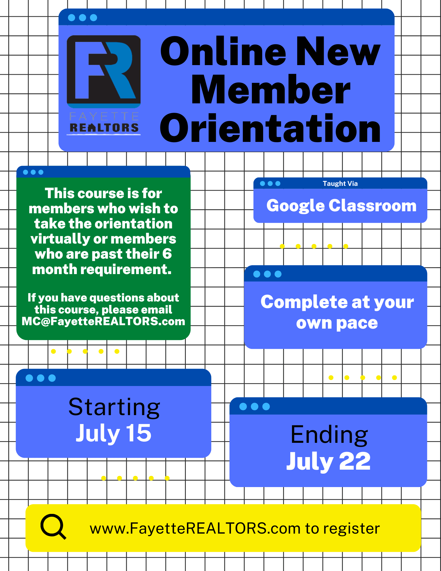 The Fayette County Board of REALTORS® Online New Member Orientation is designed to welcome and educate new members on the value, benefits, and responsibilities of REALTOR® membership at the local, state, and national levels. Hosted through Google Classroom, this self-paced course allows you to complete the required orientation on your own schedule within the designated one-week period. You’ll gain important insights into REALTOR® professionalism, ethics, safety, and the tools available to help you succeed in your career.Images