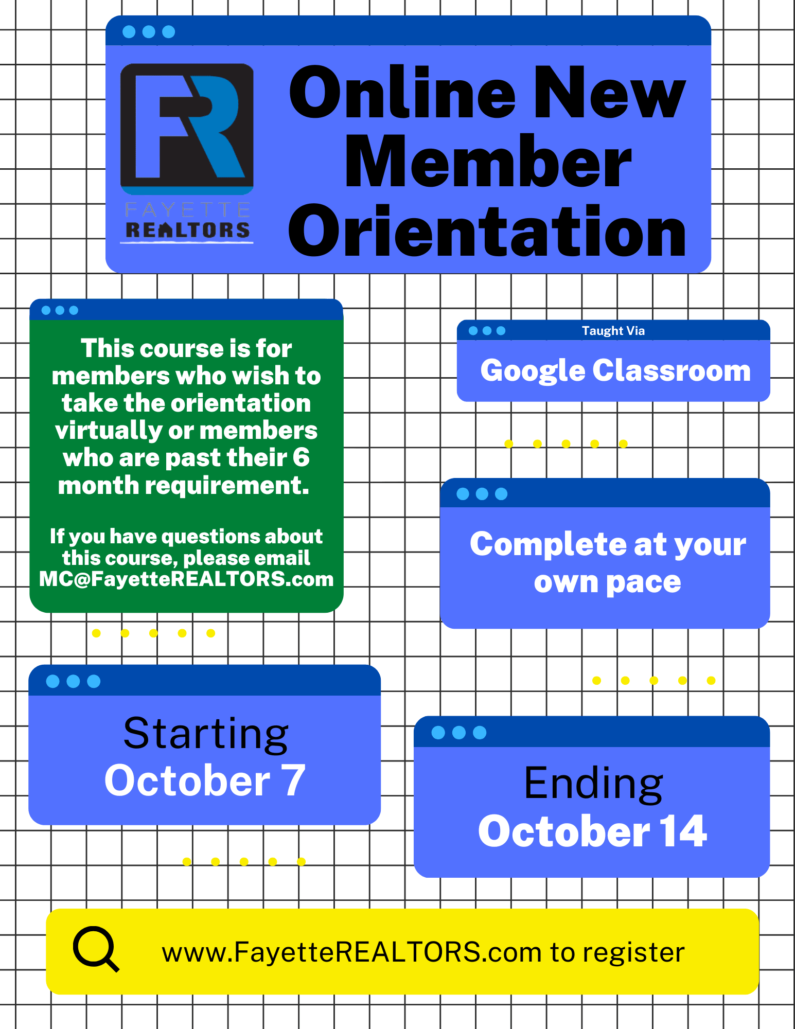 The Fayette County Board of REALTORS® Online New Member Orientation is designed to welcome and educate new members on the value, benefits, and responsibilities of REALTOR® membership at the local, state, and national levels. Hosted through Google Classroom, this self-paced course allows you to complete the required orientation on your own schedule within the designated one-week period. You’ll gain important insights into REALTOR® professionalism, ethics, safety, and the tools available to help you succeed in your career.Images