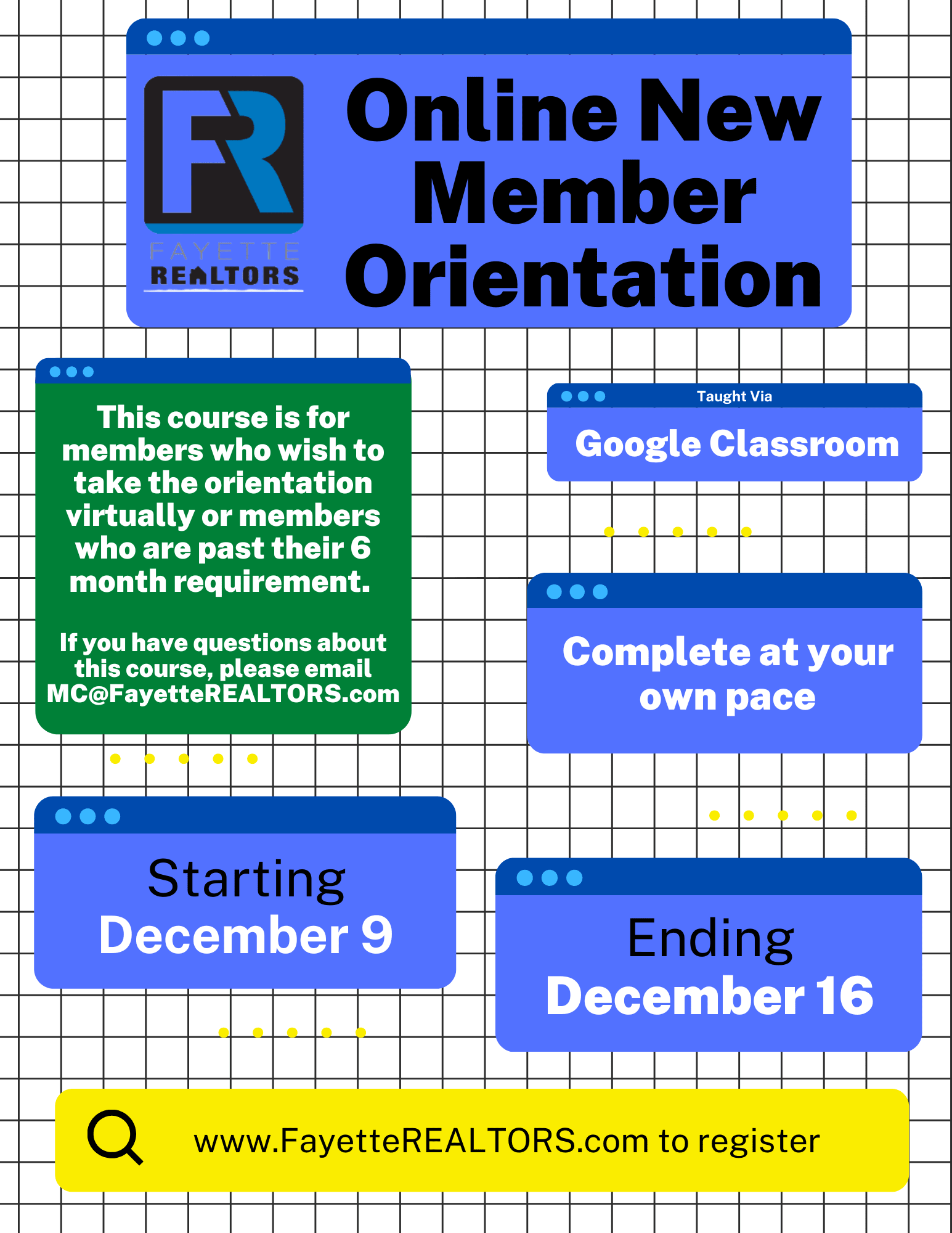 The Fayette County Board of REALTORS® Online New Member Orientation is designed to welcome and educate new members on the value, benefits, and responsibilities of REALTOR® membership at the local, state, and national levels. Hosted through Google Classroom, this self-paced course allows you to complete the required orientation on your own schedule within the designated one-week period. You’ll gain important insights into REALTOR® professionalism, ethics, safety, and the tools available to help you succeed in your career.Images