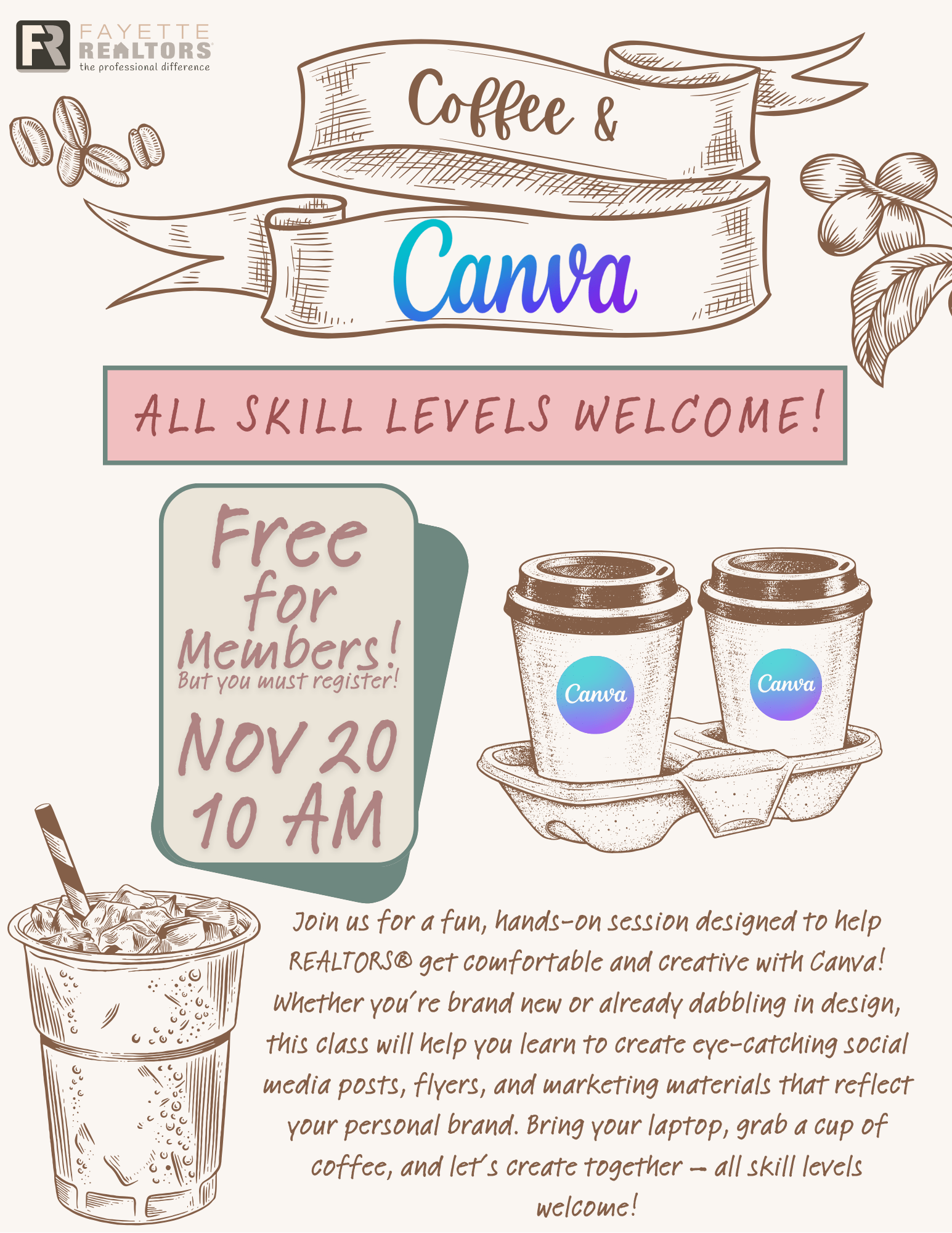 Join us for a fun, hands-on session designed to help REALTORS® get comfortable and creative with Canva! Whether you’re brand new or already dabbling in design, this class will help you learn to create eye-catching social media posts, flyers, and marketing materials that reflect your personal brand. Bring your laptop, grab a cup of coffee, and let’s create together — all skill levels welcome!Images